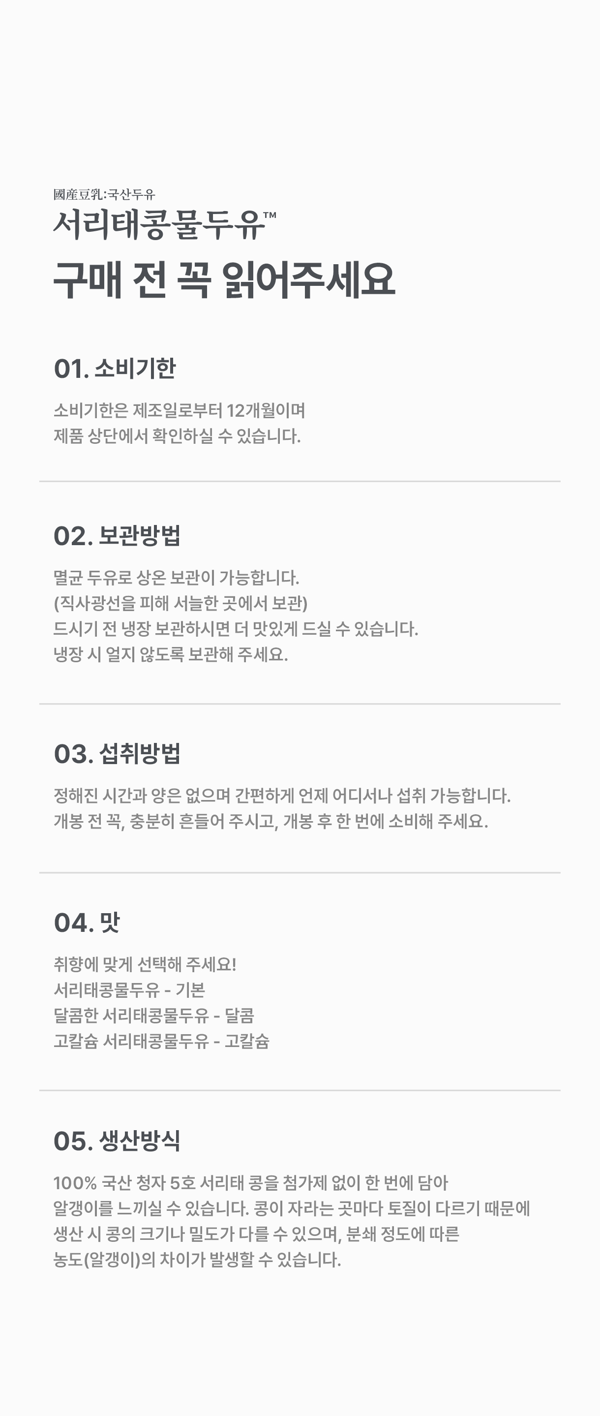 A.멸균 과정을 거친 콩물두유이기 때문에 소비기한은 제조일로부터 12개월이며, 상온에서 보관 가능합니다. 가열 및 냉동 보관은 하지 말아 주세요.