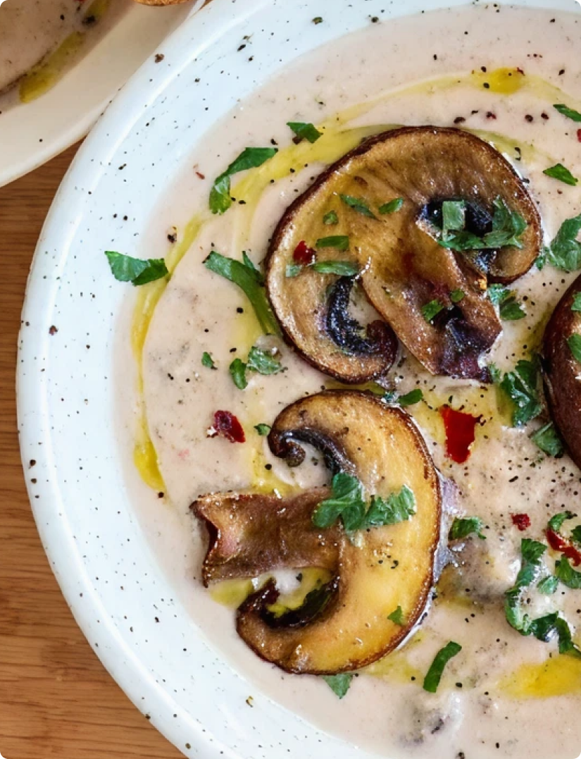 콩알갱이 듬뿍 서리태콩물두유를 넣어 더 담백하고 건강한 양송이 스프.